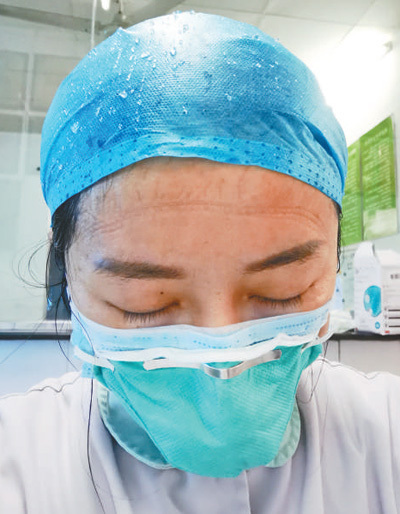 武警湖北總隊醫(yī)院衛(wèi)生防疫科“90后”護士肖瑞,堅守在防疫一線已有20多天。圖為忙碌了一天的肖瑞,走出病房脫下隔離衣,豆大的汗珠掛滿一次性工作帽,額頭上的勒痕清晰可見。吳 君 王云可攝影報道