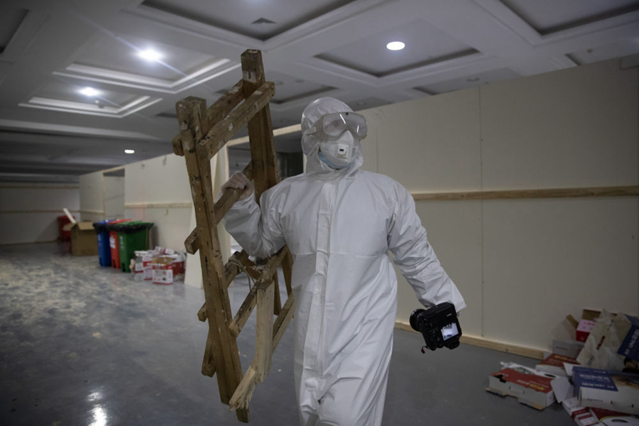 這些身影中還有被隔離的病人。江漢方艙醫(yī)院啟用的第一天,收治的首批病人里,有一個面目清秀的小伙子。入院躺下后,他打開了一本《政治秩序的起源》,安靜地閱讀。口罩遮住了他的表情,但卻藏不住眼神里的平靜和專注。看見我舉起相機,他輕輕擺了擺手,示意不用拍他,我猶豫片刻,還是執(zhí)意按下了快門。也許他并不明白,在有些喧囂的方艙醫(yī)院里,近乎靜止的他,是多么的令人震撼。