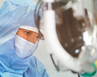 2月4日,福建晉江市一間無菌實驗室,工人正在加緊生產防護服,為防疫一線提供物資保障。新華社記者 姜克紅攝