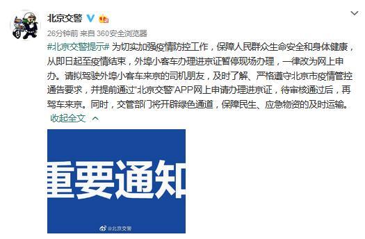 據北京市公安局公安交通管理局微博消息,為切實加強疫情防控工作,保障人民群眾生命安全和身體健康,從2月17日起至疫情結束,外埠小客車辦理進京證暫?,F場辦理,一律改為網上申辦。