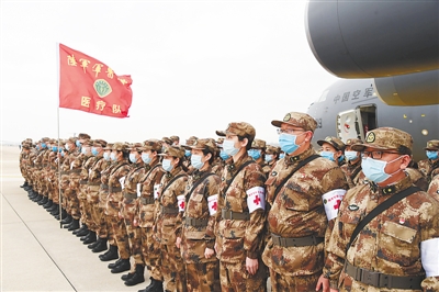 一批增援武漢的軍隊醫護人員抵達武漢天河機場。新華社發