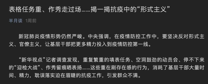西部省份一位宣傳部門負(fù)責(zé)人告訴半月談?dòng)浾撸麄兛h成立了疫情指揮部,并下設(shè)不同組,但組與組之間缺乏溝通,實(shí)際上仍然各自為政。“就拿防疫與檢測(cè)工作來(lái)講,指揮部統(tǒng)一安排后,其他部門依然安排本部門、本行業(yè)的防疫及檢測(cè)。基層人手本就不夠,各部門再各吹各的號(hào),就更亂了。”