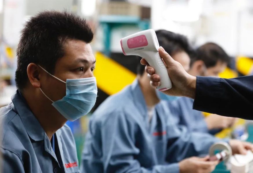 2月10日,廣東格蘭仕集團(tuán)有限公司順德總部車間生產(chǎn)線上的員工測(cè)體溫。新華社記者 黃國(guó)保 攝