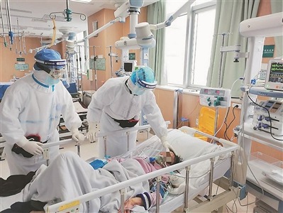 江蘇省人民醫院呼吸與危重癥醫學科副主任、主任醫師,武漢市第一醫院國家醫療隊聯合專家組組長齊栩(右一)和同事在武漢市第一醫院重癥監護病區給危重癥患者進行檢查。