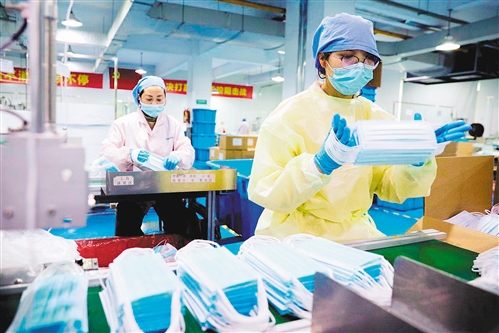 2月14日,浙江省長(zhǎng)興縣和平鎮(zhèn)長(zhǎng)興美迪康無紡布制品有限公司員工加緊生產(chǎn)口罩。 許 旭攝(中經(jīng)視覺)