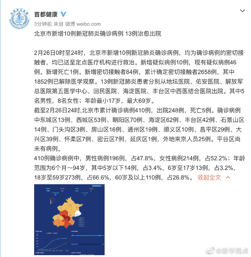 2月26日0時至24時,北京市新增10例新冠肺炎確診病例,均為確診病例的密切接觸者,均已送至定點醫療機構進行救治。新增疑似病例10例,現有疑似病例46例。新增死亡1例。新增密切接觸者84例,累計確定密切接觸者2658例,其中1852例已解除醫學觀察。13例新冠肺炎患者分別從地壇醫院、佑安醫院、解放軍總醫院第五醫學中心、回民醫院、海淀醫院、豐臺區中西醫結合醫院出院。其中5名男性,8名女性;年齡最小17歲,最大69歲。