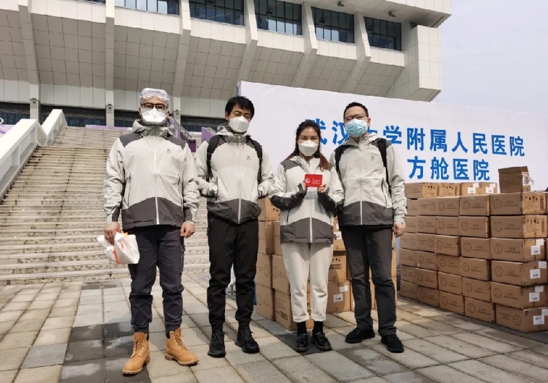 2月21日,人民網(wǎng)記者進(jìn)入洪山體育館武昌方艙醫(yī)院采訪前合影。右二為記者張嬋。