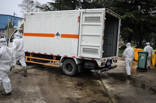 2月26日,湖北省武漢市,幾名醫(yī)療廢物處理員在搬運醫(yī)療垃圾。中青報·中青網(wǎng)記者 趙迪/攝