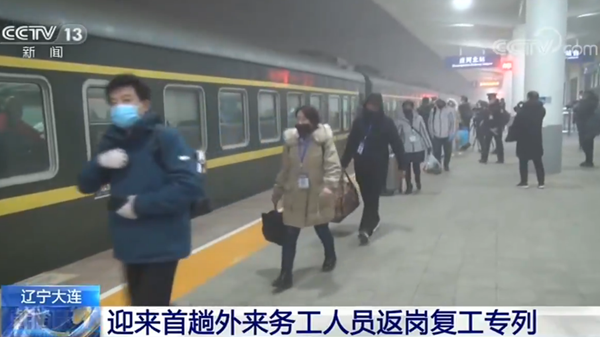 29日凌晨1時(shí)05分,由黑龍江省訥河開(kāi)往遼寧大連莊河的K4082次務(wù)工人員返崗復(fù)工專(zhuān)列順利到達(dá)莊河北站。這是遼寧大連迎來(lái)的首趟外來(lái)務(wù)工人員返崗復(fù)工專(zhuān)列,521名務(wù)工人員分別來(lái)自黑龍江訥河、齊齊哈爾等列沿線的兩省六市。