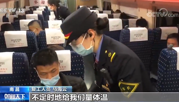 復(fù)工人員 馬海云:這一趟列車(chē)是(政府)給我們免費(fèi)提供的,沒(méi)有掏一毛錢(qián)的票錢(qián),然后列車(chē)不定時(shí)地在里面消毒,不定時(shí)地給我們量體溫,衛(wèi)生環(huán)境也很好,搞得很干凈。