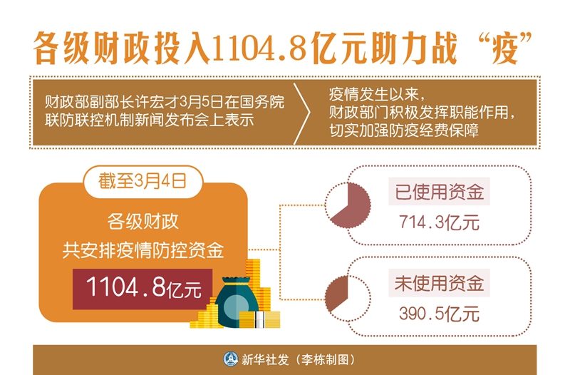 新華社北京3月5日電(記者申鋮、劉紅霞)財政部副部長許宏才5日在國務院聯(lián)防聯(lián)控機制新聞發(fā)布會上表示,疫情發(fā)生以來,財政部門積極發(fā)揮職能作用,切實加強防疫經(jīng)費保障,截至3月4日,各級財政共安排疫情防控資金1104.8億元。