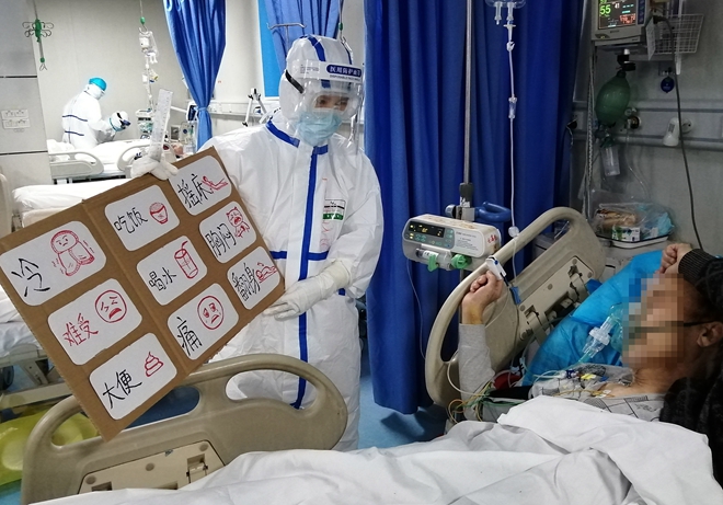 在武漢市第五醫院重癥病區,醫護人員每天面對的都是重癥病人,他們普遍病情嚴重,要靠氣管插管維持,幾乎不能說話。偶爾有能說話的病人,方言又重。