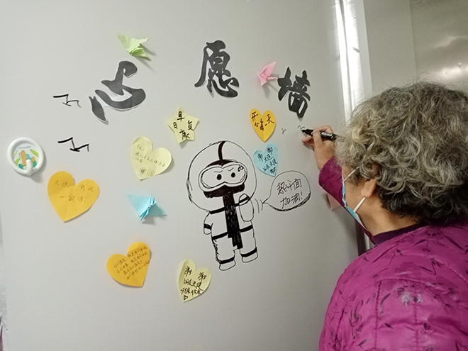 患者在手繪心愿墻上畫海鷗寫心愿。