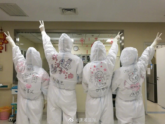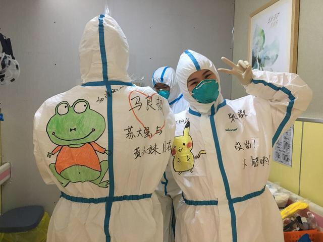 不謀而合,奮戰在黃石的醫護人員從網上找素材,在防護服上畫漫畫。當她們穿著畫著卡通圖案的防護服走進病房時,孩子們沒有哭,而是睜大眼睛看著,眼神里滿是欣喜,臉上露出了笑容。