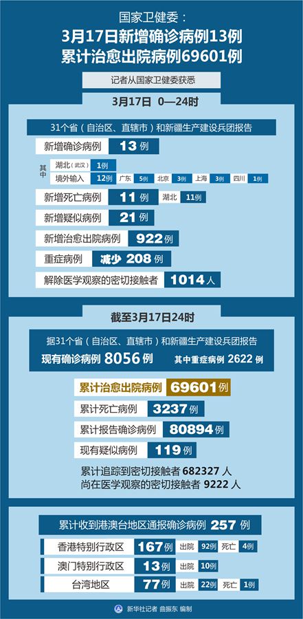 新華社北京3月18日電(記者安蓓、溫競華)記者18日從國家衛生健康委員會了解到,3月17日0-24時,31個省(自治區、直轄市)和新疆生產建設兵團報告新增確診病例13例,新增死亡病例11例(湖北11例),新增疑似病例21例。