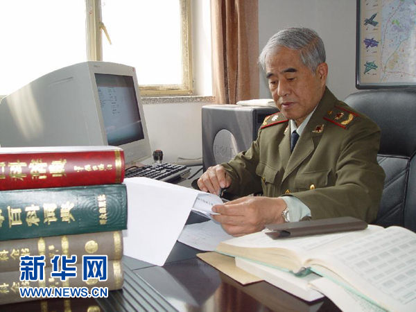 邱成龍在辦公室整理學術資料(資料照片)。 新華社發(何鐘 攝)