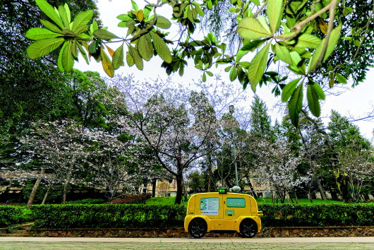 ▲一輛5G無人攝像車在武漢大學(xué)櫻花大道進(jìn)行不間斷無人巡游,實(shí)時(shí)采集和傳輸直播圖像信號。(3月16日攝) 新華社記者費(fèi)茂華攝