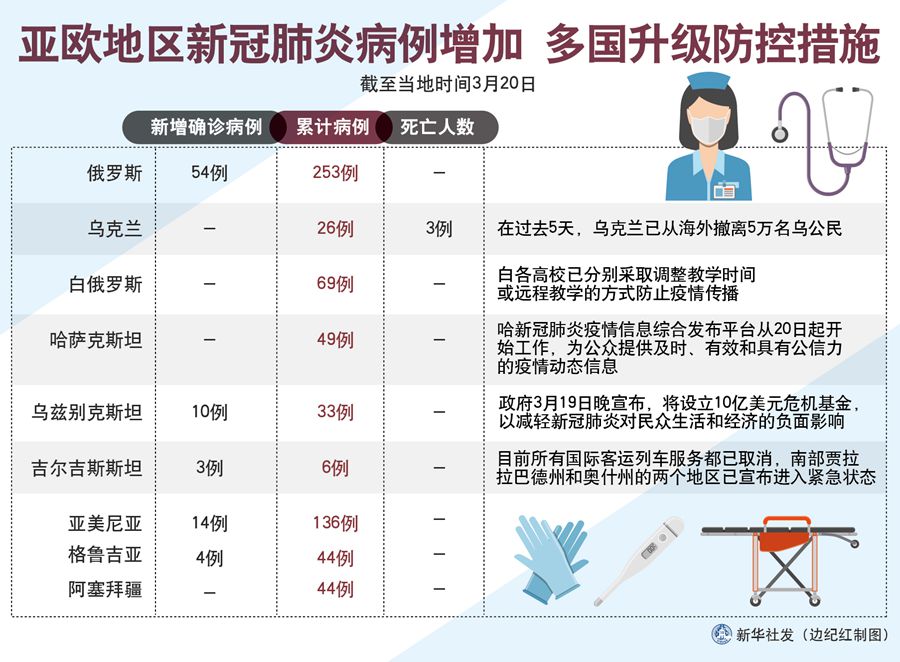 新華社莫斯科3月21日電 綜合新華社駐亞歐地區記者報道:亞歐地區新冠肺炎確診病例20日繼續增加,多國采取暫??瓦\等防控措施。