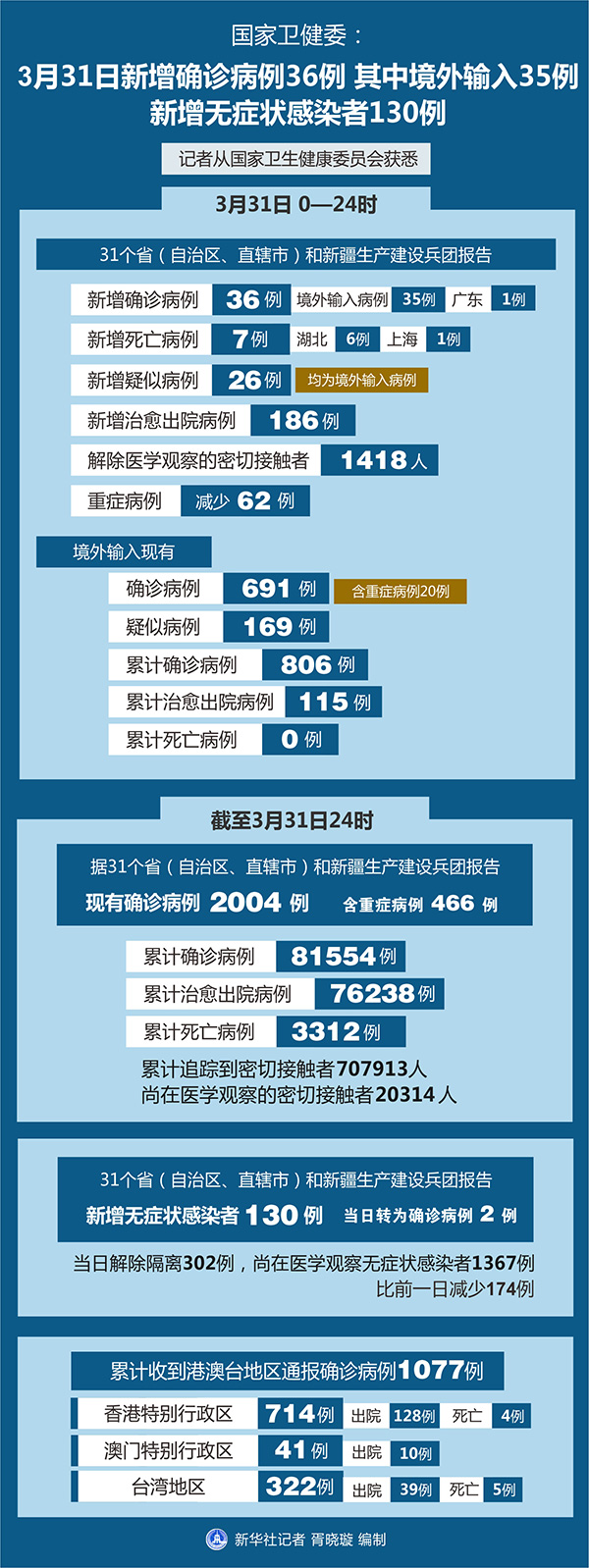 截至3月31日24時,據31個省(自治區、直轄市)和新疆生產建設兵團報告,現有確診病例2004例(含重癥病例466例),現有疑似病例172例。累計確診病例81554例,累計治愈出院病例76238例,累計死亡病例3312例,累計追蹤到密切接觸者707913人,尚在醫學觀察的密切接觸者20314人。