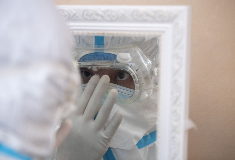 ↑3月13日晚,“擺渡人”小分隊隊員楊暉檢查護目鏡的佩戴情況。隊員的防護措施同重癥病房的醫(yī)生一樣,完成所有防護措施要經(jīng)過12個步驟。在華中科技大學同濟醫(yī)學院附屬同濟醫(yī)院光谷院區(qū),有很多生命“擺渡人”。“擺渡人”日夜在醫(yī)院與醫(yī)院之間,留觀點與醫(yī)院之間穿梭不停,轉(zhuǎn)運新冠肺炎患者。