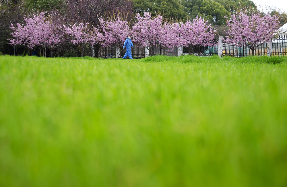 ↑3月3日,一名工作人員從盛開的櫻花樹下走過。由于學校進行封閉管理,我在這幾顆櫻花樹旁等了一個多小時,只遇到了兩個人。