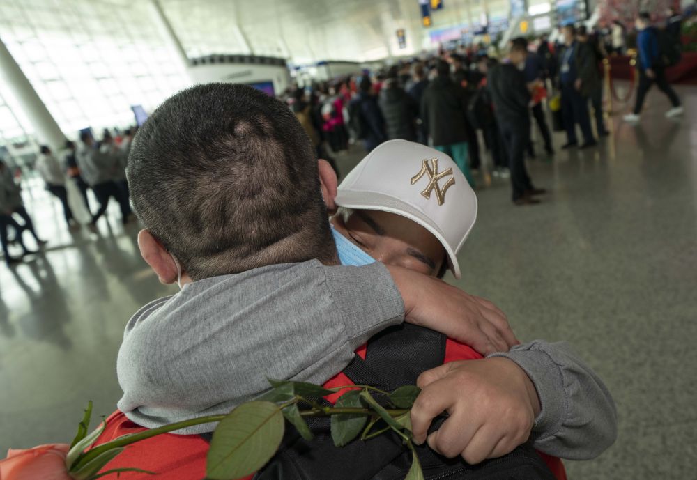 ↑3月19日,在武漢天河機場,河南醫(yī)療隊隊員郭燕姿緊緊抱住丈夫王國曉。 夫妻二人都來自河南新鄉(xiāng),王國曉是醫(yī)生,郭燕姿是護士長。2月9日,夫妻倆馳援武漢,隨后,郭燕姿被分配到青山方艙醫(yī)院工作,而王國曉則被分配到了另外一個區(qū)。從那以后,夫妻倆已有一個多月沒有見面。3月19日當天,夫妻倆在機場重逢。
