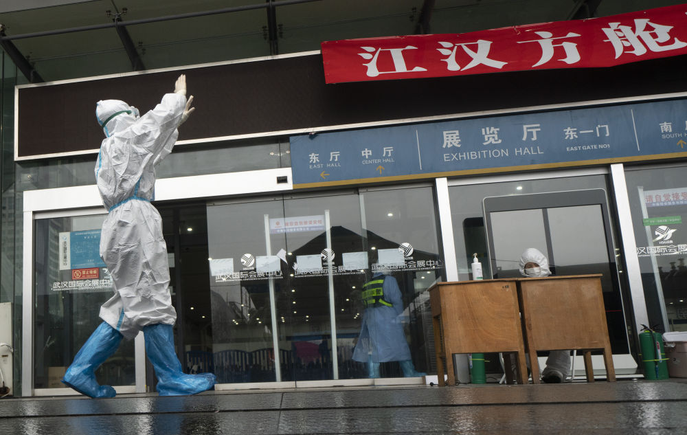 ↑3月9日,最后一位走出江漢方艙醫(yī)院的醫(yī)護人員、武漢協(xié)和醫(yī)院醫(yī)生逯翀向方艙醫(yī)院揮手告別。