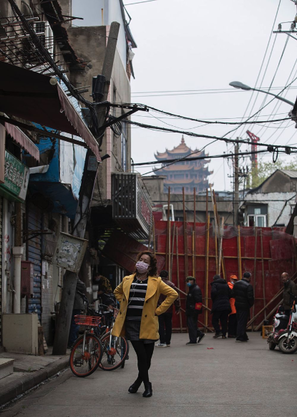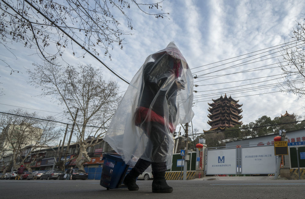 ↑3月15日,一位身穿自制“防護服”的女士上街買菜時從黃鶴樓下走過。她說她近兩個月來,只出過兩次門。