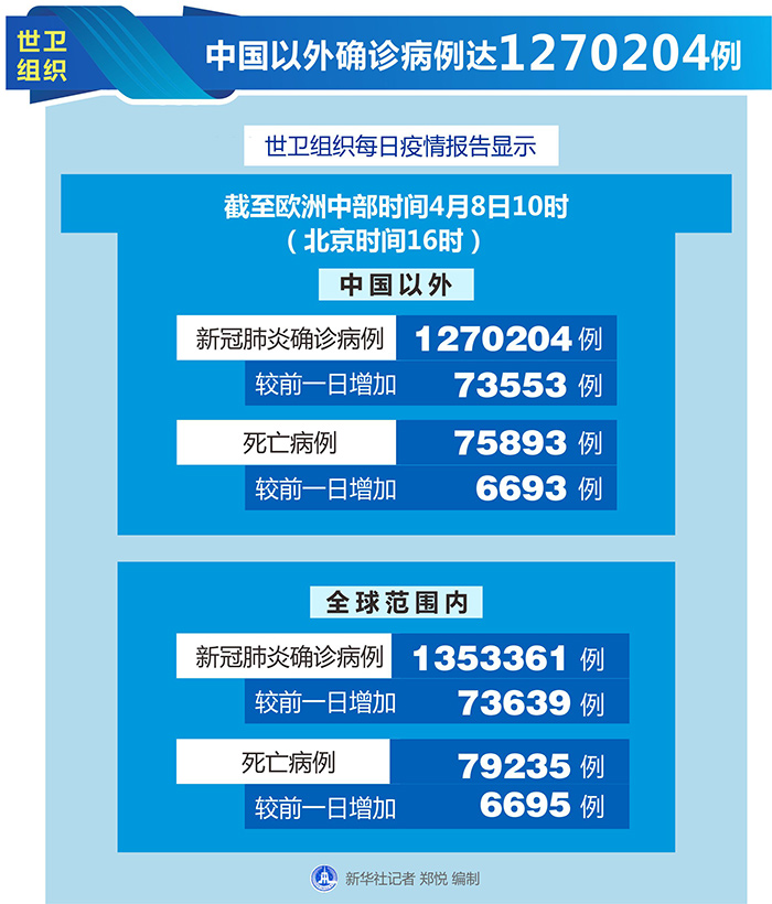 新華社日內瓦4月8日電(記者劉曲)世界衛(wèi)生組織8日公布的最新數(shù)據顯示,中國以外新冠確診病例達到1270204例。