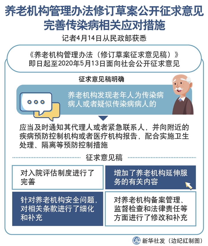 新華社北京4月14日電(記者孫少龍)記者14日從民政部獲悉,《養老機構管理辦法(修訂草案征求意見稿)》即日起至2020年5月13日面向社會公開征求意見,結合新冠肺炎疫情防控要求,征求意見稿依法完善了養老機構發現老年人為傳染病病人或者疑似傳染病病人時的應對措施。