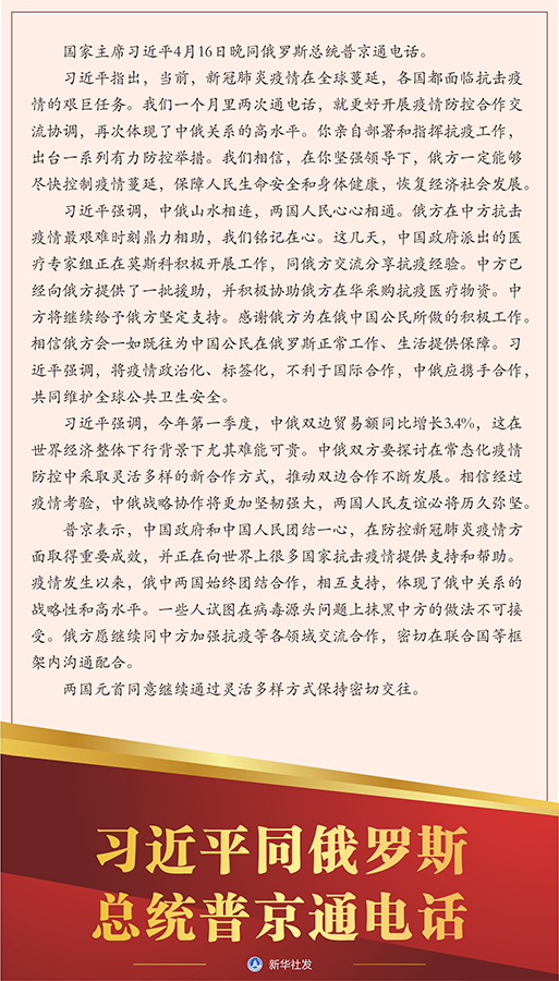 習(xí)近平指出,當(dāng)前,新冠肺炎疫情在全球蔓延,各國(guó)都面臨抗擊疫情的艱巨任務(wù)。我們一個(gè)月里兩次通電話(huà),就更好開(kāi)展疫情防控合作交流協(xié)調(diào),再次體現(xiàn)了中俄關(guān)系的高水平。你親自部署和指揮抗疫工作,出臺(tái)一系列有力防控舉措。我們相信,在你堅(jiān)強(qiáng)領(lǐng)導(dǎo)下,俄方一定能夠盡快控制疫情蔓延,保障人民生命安全和身體健康,恢復(fù)經(jīng)濟(jì)社會(huì)發(fā)展。