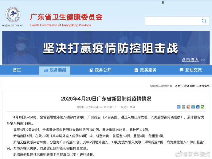 4月19日0-24時,全省新增境外輸入確診病例1例,廣州報告(來自英國,通過入境口岸發現,入關后即被隔離觀察)。累計報告境外輸入病例191例。