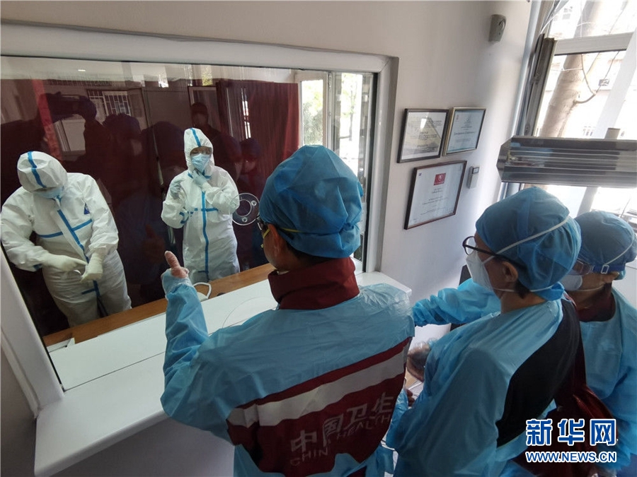 4月11日,在塞爾維亞首都貝爾格萊德,中國赴塞爾維亞抗疫醫療專家組在貝爾格萊德一所門診走訪,為醫護人員的防護意識點贊。新華社發(中國赴塞爾維亞抗疫醫療專家組供圖)