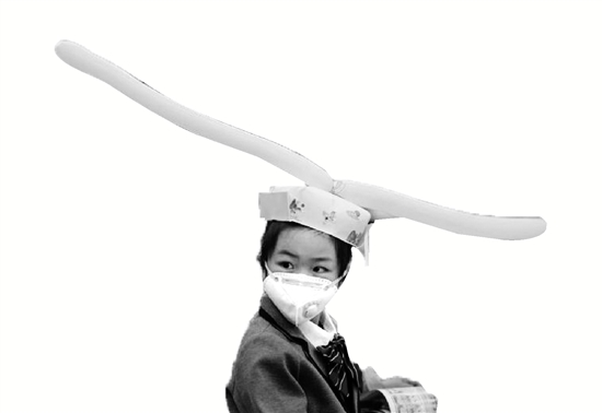 有的是在帽頂上粘了兩只棍子狀的氣球,從左右兩邊長長地伸了出去;有的是把動(dòng)畫片《超級飛俠》的主角,一架叫“樂迪”的飛機(jī)戴在了頭上當(dāng)帽子,兩側(cè)機(jī)翼展開,剛好一米長;還有的帽子左邊一只長頸鹿,右邊一只大象,脖子長加上鼻子長,也夠一米了;更多娃的帽子,像極了宋朝的官帽。