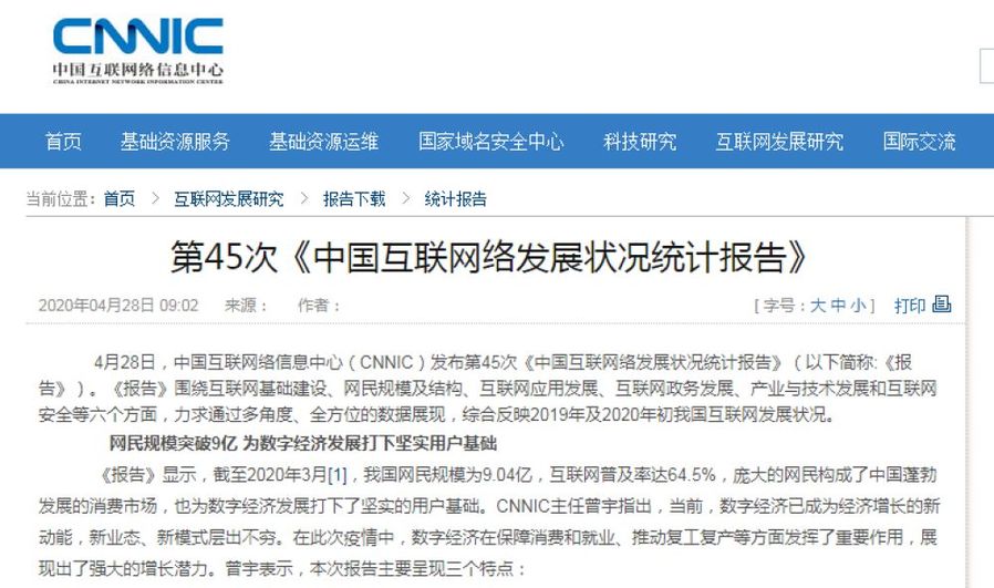 4月28日,中國互聯(lián)網(wǎng)絡(luò)信息中心(CNNIC)發(fā)布第45次《中國互聯(lián)網(wǎng)絡(luò)發(fā)展狀況統(tǒng)計報告》(以下簡稱:《報告》)。《報告》圍繞互聯(lián)網(wǎng)基礎(chǔ)建設(shè)、網(wǎng)民規(guī)模及結(jié)構(gòu)、互聯(lián)網(wǎng)應(yīng)用發(fā)展、互聯(lián)網(wǎng)政務(wù)發(fā)展、產(chǎn)業(yè)與技術(shù)發(fā)展和互聯(lián)網(wǎng)安全等六個方面,力求通過多角度、全方位的數(shù)據(jù)展現(xiàn),綜合反映2019年及2020年初我國互聯(lián)網(wǎng)發(fā)展狀況。