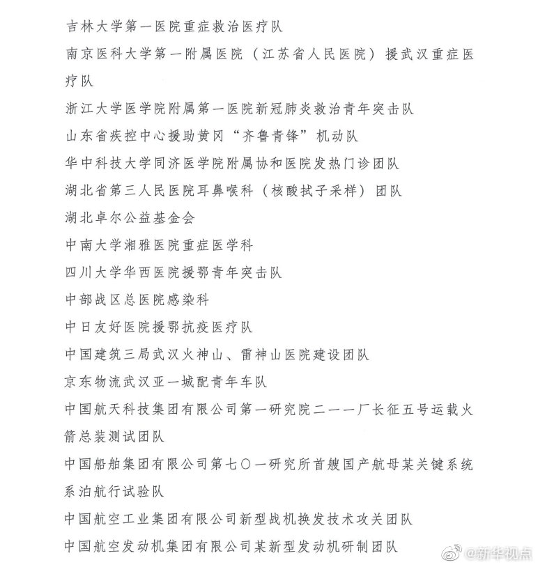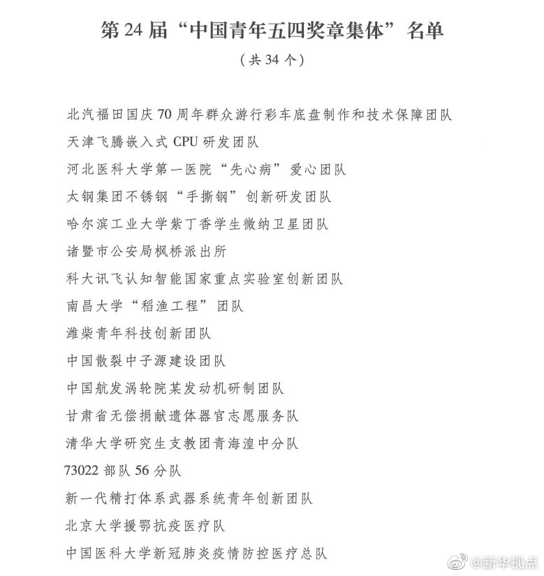 榮獲“中國青年五四獎章集體”的分別是:北汽福田國慶70周年群眾游行彩車底盤制作和技術保障團隊,天津飛騰嵌入式CPU研發團隊,河北醫科大學第一醫院“先心病”愛心團隊,太鋼集團不銹鋼“手撕鋼”創新研發團隊,哈爾濱工業大學紫丁香學生微納衛星團隊,諸暨市公安局楓橋派出所,科大訊飛認知智能國家重點實驗室創新團隊,南昌大學“稻漁工程”團隊,濰柴青年科技創新團隊,中國散裂中子源建設團隊,中國航發渦輪院某發動機研制團隊,甘肅省無償捐獻遺體器官志愿服務隊,清華大學研究生支教團青海湟中分隊,73022部隊56分隊,新一代精打體系武器系統青年創新團隊,北京大學援鄂抗疫醫療隊,中國醫科大學新冠肺炎疫情防控醫療總隊,吉林大學第一醫院重癥救治醫療隊,南京醫科大學第一附屬醫院(江蘇省人民醫院)援武漢重癥醫療隊,浙江大學醫學院附屬第一醫院新冠肺炎救治青年突擊隊,山東省疾控中心援助黃岡“齊魯青鋒”機動隊,華中科技大學同濟醫學院附屬協和醫院發熱門診團隊,湖北省第三人民醫院耳鼻喉科(核酸拭子采樣)團隊,湖北卓爾公益基金會,中南大學湘雅醫院重癥醫學科,四川大學華西醫院援鄂青年突擊隊,中部戰區總醫院感染科,中日友好醫院援鄂抗疫醫療隊,中國建筑三局武漢火神山、雷神山醫院建設團隊,京東物流武漢亞一城配青年車隊,中國航天科技集團有限公司第一研究院二一一廠長征五號運載火箭總裝測試團隊,中國船舶集團有限公司第七〇一研究所首艘國產航母某關鍵系統系泊航行試驗隊,中國航空工業集團有限公司新型戰機換發技術攻關團隊,中國航空發動機集團有限公司某新型發動機研制團隊。
