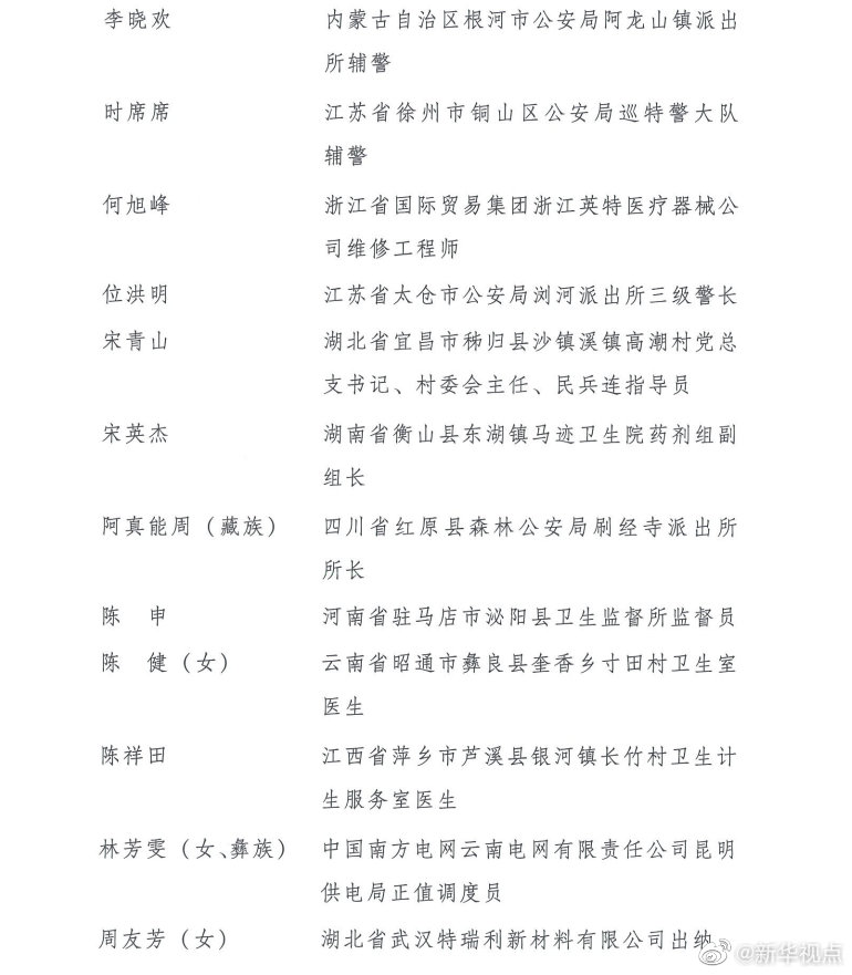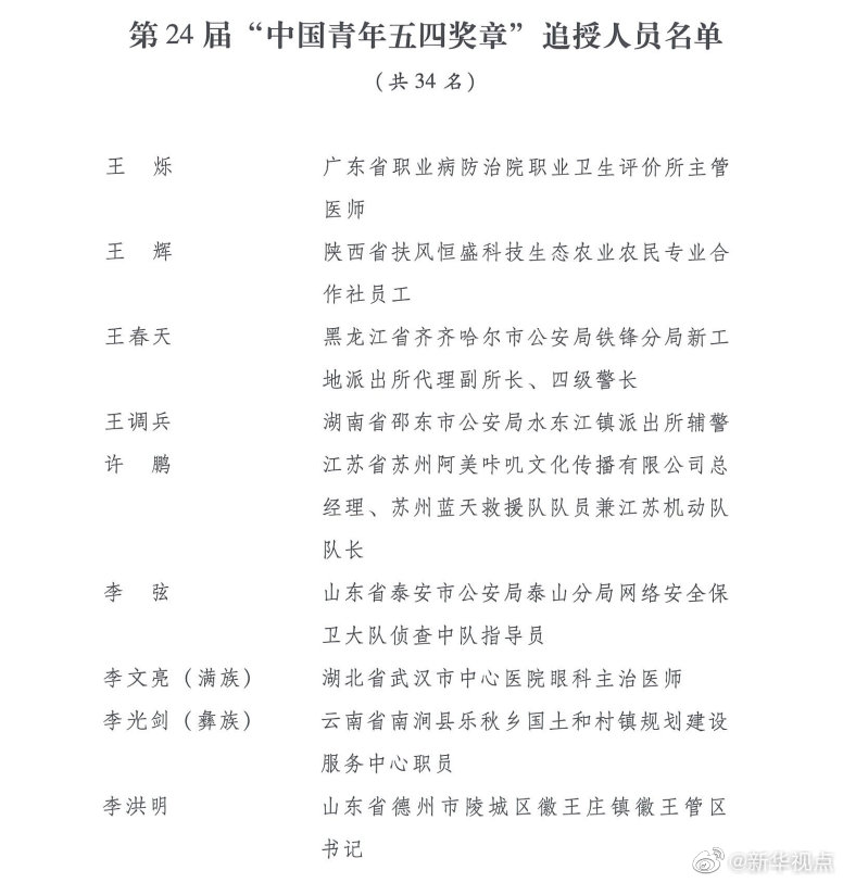 第24屆“中國青年五四獎章”追授人員分別是:廣東省職業病防治院職業衛生評價所主管醫師王爍,陜西省扶風恒盛科技生態農業農民專業合作社員工王輝,黑龍江省齊齊哈爾市公安局鐵鋒分局新工地派出所代理副所長、四級警長王春天,湖南省邵東市公安局水東江鎮派出所輔警王調兵,江蘇省蘇州阿美咔嘰文化傳播有限公司總經理、蘇州藍天救援隊隊員兼江蘇機動隊隊長許鵬,山東省泰安市公安局泰山分局網絡安全保衛大隊偵查中隊指導員李弦,湖北省武漢市中心醫院眼科主治醫師李文亮(滿族),云南省南澗縣樂秋鄉國土和村鎮規劃建設服務中心職員李光劍(彝族),山東省德州市陵城區徽王莊鎮徽王管區書記李洪明,內蒙古自治區根河市公安局阿龍山鎮派出所輔警李曉歡,江蘇省徐州市銅山區公安局巡特警大隊輔警時席席,浙江省國際貿易集團浙江英特醫療器械公司維修工程師何旭峰,江蘇省太倉市公安局瀏河派出所三級警長位洪明,湖北省宜昌市秭歸縣沙鎮溪鎮高潮村黨總支書記、村委會主任、民兵連指導員宋青山,湖南省衡山縣東湖鎮馬跡衛生院藥劑組副組長宋英杰,四川省紅原縣森林公安局刷經寺派出所所長阿真能周(藏族),河南省駐馬店市泌陽縣衛生監督所監督員陳申,云南省昭通市彝良縣奎香鄉寸田村衛生室醫生陳健(女),江西省萍鄉市蘆溪縣銀河鎮長竹村衛生計生服務室醫生陳祥田,中國南方電網云南電網有限責任公司昆明供電局正值調度員林芳雯(女、彝族),湖北省武漢特瑞利新材料有限公司出納周友芳(女),安徽省銅陵市樅陽縣公安局特(巡)警大隊輔警一中隊副隊長胡鋒,四川省甘孜藏族自治州得榮縣龍絨寺寺廟管理委員會主任洛絨益西(藏族),四川省廣元經開區盤龍鎮深溝村村民宮高明,江蘇省南京市公安局高淳分局淳溪派出所輔警袁劍雄,山東省泰安市岱岳區角峪鎮先鋒村村民賈慶臣,湖北省武漢市蔡甸區人民醫院住院醫師夏思思(女),江蘇省南京市公安局行政審批服務處網絡政務科一級警員徐昊,江蘇省徐州市沛縣公安局五段派出所輔警章良志,湖北省武漢市江夏區第一人民醫院醫師彭銀華,廣東省英德市公安局橋頭派出所輔警曾文聰,江西省蓮花縣湖上鄉中心衛生院醫生熊波,河南省鄭州市公安局東風路分局治安管理服務大隊三中隊民警、四級警長樊樹鋒,甘肅省舟曲縣扶貧辦副主任張小娟(女、藏族)。