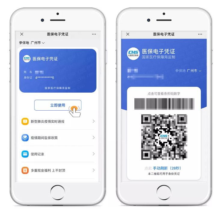 在你需要掛號、支付醫(yī)藥費、入院登記、出院結(jié)算、藥店買藥等時候,點擊醫(yī)保電子憑證下方的“立即使用”,將出現(xiàn)的條形碼和二維碼向醫(yī)院或藥店出示,即可“無接觸”完成驗證支付。