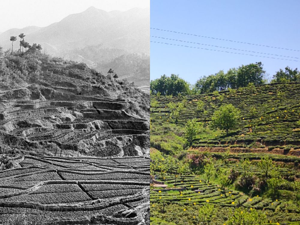 (左圖:1957年金寨的梯田,新華社稿張斌攝;右圖:2019年金寨的茶園。新華社記者陳諾攝)