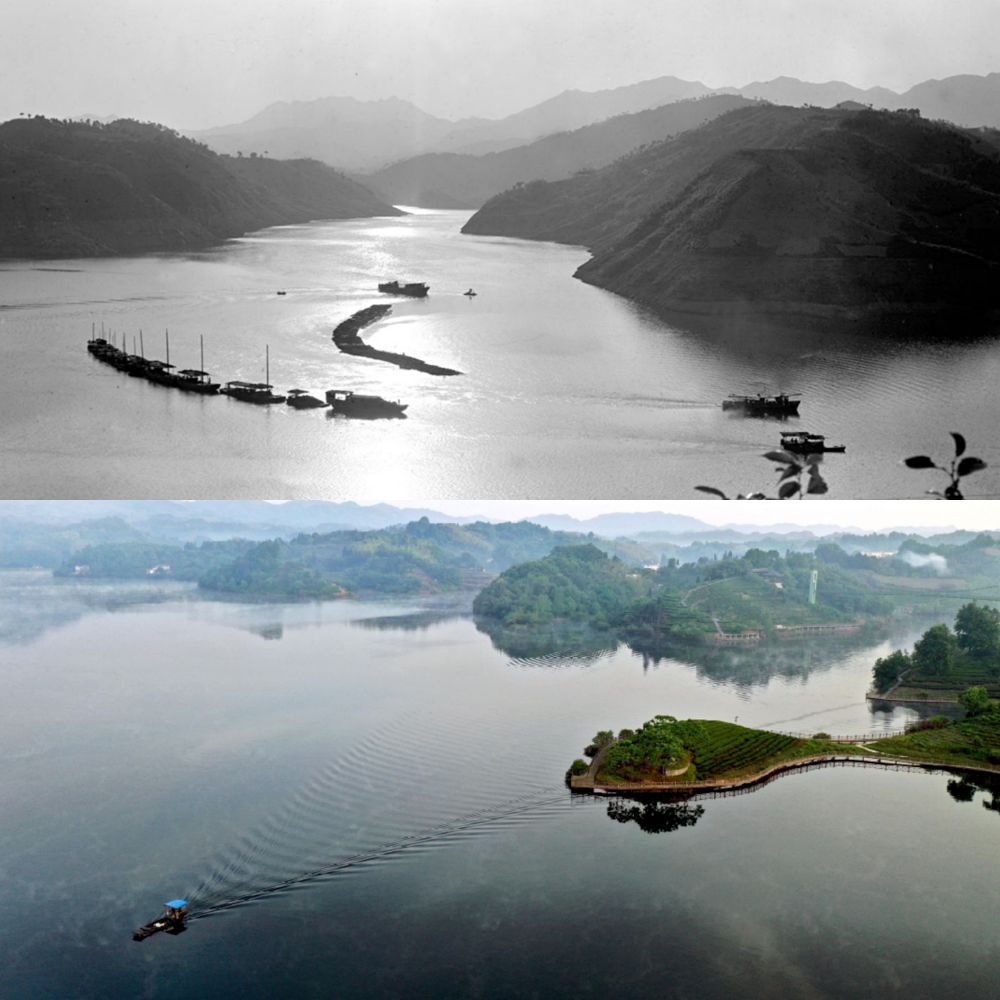(上圖:1976年金寨的水庫,新華社記者成大林攝;下圖:2019年水庫之上是茶谷。新華社記者陶明攝)