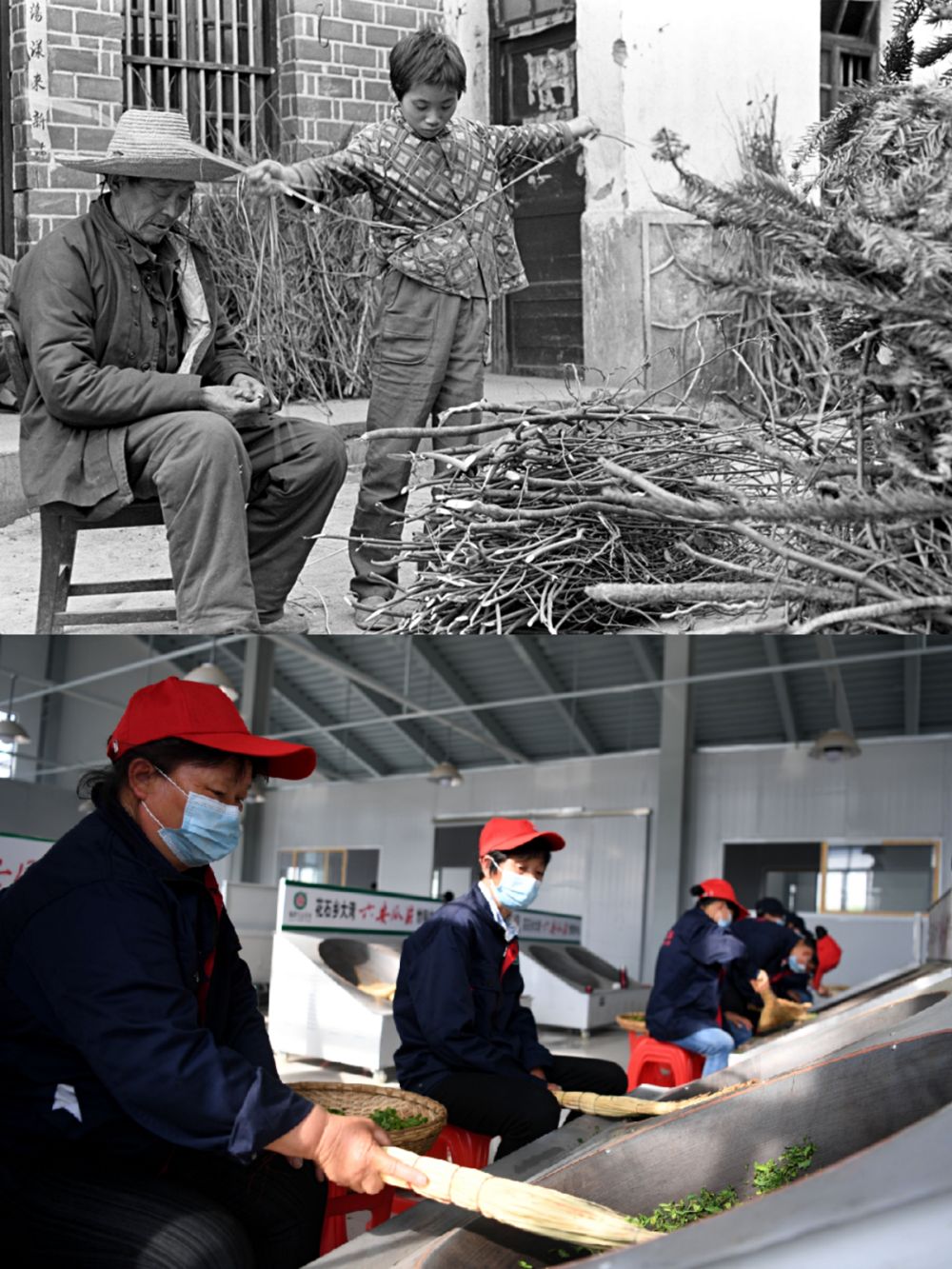 (上圖:過去金寨人守著柴火過日子,新華社記者張曙光攝;下圖:2020年4月16日,大灣村村民在金寨縣花石鄉(xiāng)茶產(chǎn)業(yè)扶貧車間里加工茶葉。新華社記者劉軍喜攝)