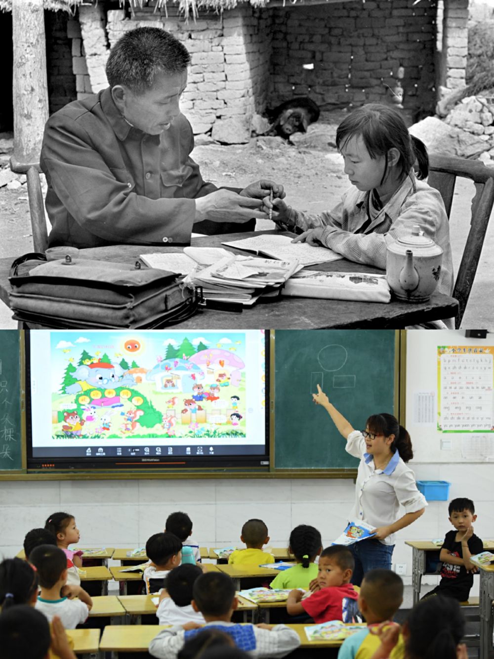 (上圖:1991年5月,金寨縣希望小學老師胡遵訓跑20多里山路為學生胡亞麗補課,新華社記者張曙光攝;下圖:2019年9月3日,金寨縣希望小學南校區(qū)學生通過多媒體上課。新華社記者劉軍喜攝)