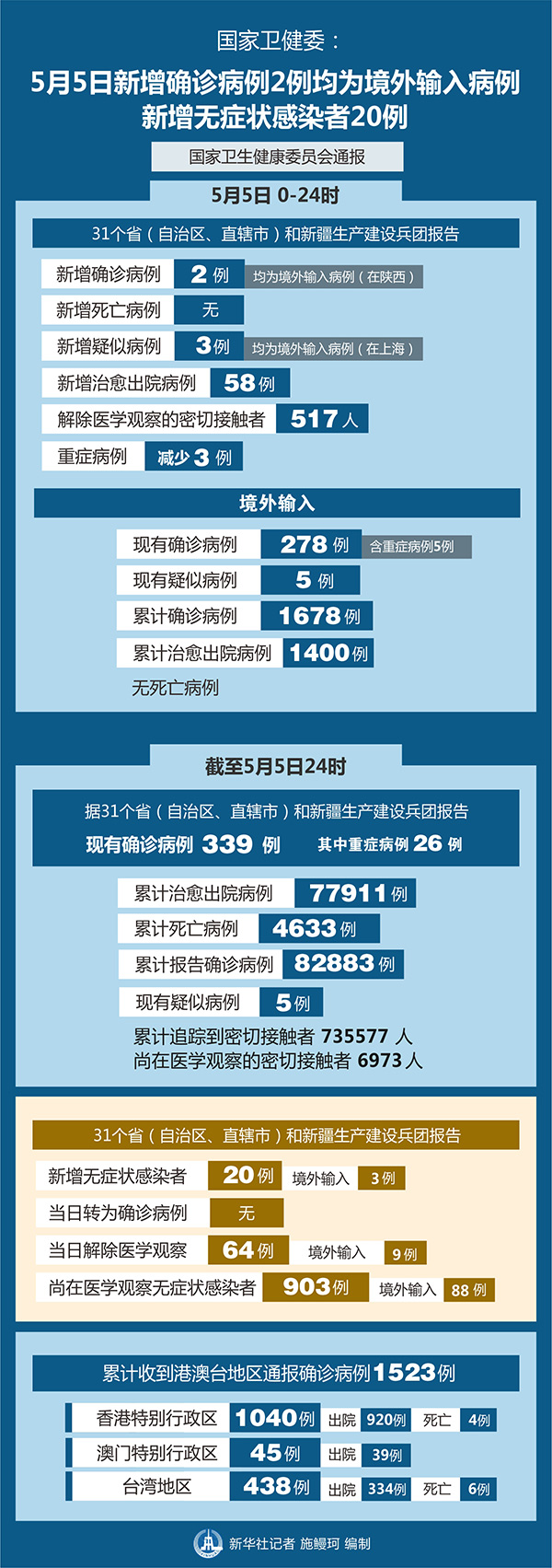 截至5月5日24時(shí),據(jù)31個(gè)省(自治區(qū)、直轄市)和新疆生產(chǎn)建設(shè)兵團(tuán)報(bào)告,現(xiàn)有確診病例339例(其中重癥病例26例),累計(jì)治愈出院病例77911例,累計(jì)死亡病例4633例,累計(jì)報(bào)告確診病例82883例,現(xiàn)有疑似病例5例。累計(jì)追蹤到密切接觸者735577人,尚在醫(yī)學(xué)觀察的密切接觸者6973人。