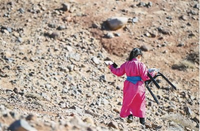 內蒙古自治區(qū)阿拉善左旗蒙古族學校四年級學生策耿拿著板凳尋找避風處上網(wǎng)課。新華社記者 連 振攝