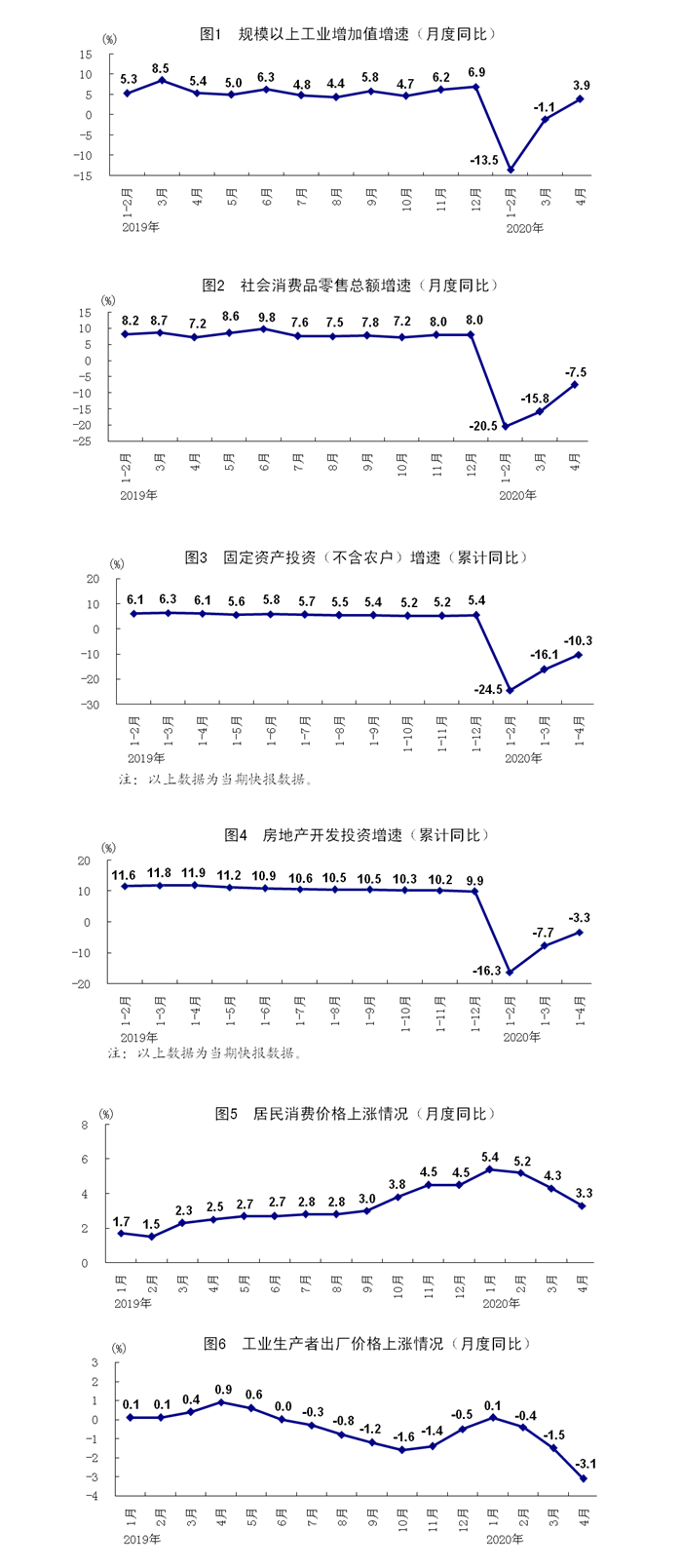 4月份,全國規(guī)模以上工業(yè)增加值同比增長3.9%,3月份為下降1.1%;環(huán)比增長2.27%。1-4月份,全國規(guī)模以上工業(yè)增加值同比下降4.9%,降幅比1-3月份收窄3.5個百分點。4月份,分經(jīng)濟類型看,國有控股企業(yè)增加值增長0.5%;股份制企業(yè)增長4.0%,外商及港澳臺商投資企業(yè)增長3.9%;私營企業(yè)增長7.0%。分三大門類看,采礦業(yè)增加值增長0.3%;制造業(yè)增長5.0%,3月份為下降1.8%;電力、熱力、燃氣及水生產(chǎn)和供應(yīng)業(yè)增長0.2%。高技術(shù)制造業(yè)和裝備制造業(yè)增長較快。4月份,高技術(shù)制造業(yè)和裝備制造業(yè)增加值分別增長10.5%和9.3%,快于規(guī)模以上工業(yè)6.6和5.4個百分點。從產(chǎn)品產(chǎn)量看,光纜,挖掘、鏟土運輸機械,集成電路,工業(yè)機器人,微型計算機設(shè)備產(chǎn)量同比分別增長43.8%、40.8%、29.2%、26.6%、26.2%。