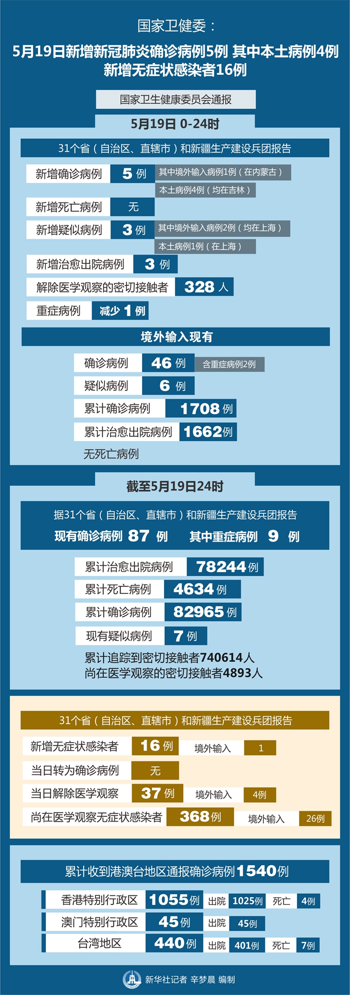 截至5月19日24時(shí),據(jù)31個(gè)省(自治區(qū)、直轄市)和新疆生產(chǎn)建設(shè)兵團(tuán)報(bào)告,現(xiàn)有確診病例87例(其中重癥病例9例),累計(jì)治愈出院病例78244例,累計(jì)死亡病例4634例,累計(jì)報(bào)告確診病例82965例,現(xiàn)有疑似病例7例。累計(jì)追蹤到密切接觸者740614人,尚在醫(yī)學(xué)觀察的密切接觸者4893人。