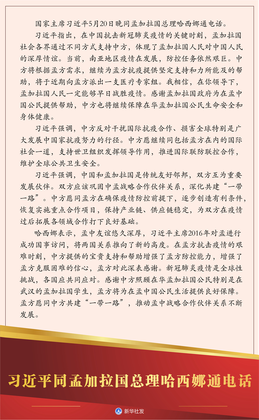 習近平指出,在中國抗擊新冠肺炎疫情的關鍵時刻,孟加拉國社會各界通過不同方式支持中方,體現了孟加拉國人民對中國人民的深厚情誼。當前,南亞地區(qū)疫情在發(fā)展,防控任務依然艱巨。中方將根據孟方需求,繼續(xù)為孟方抗疫提供堅定支持和力所能及的幫助,將于近期向孟方派出一支醫(yī)療專家組。我相信,在你領導下,孟加拉國人民一定能夠早日戰(zhàn)勝疫情。感謝孟加拉國政府為在孟中國公民提供幫助,中方也將繼續(xù)保障在華孟加拉國公民生命安全和身體健康。