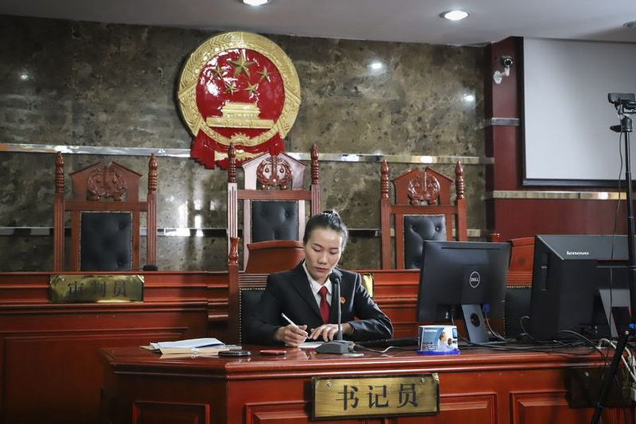↑李金蓮在迪慶州中級人民法院法庭上準備開庭工作(5月7日攝)。新華社發(肖竹尹攝)