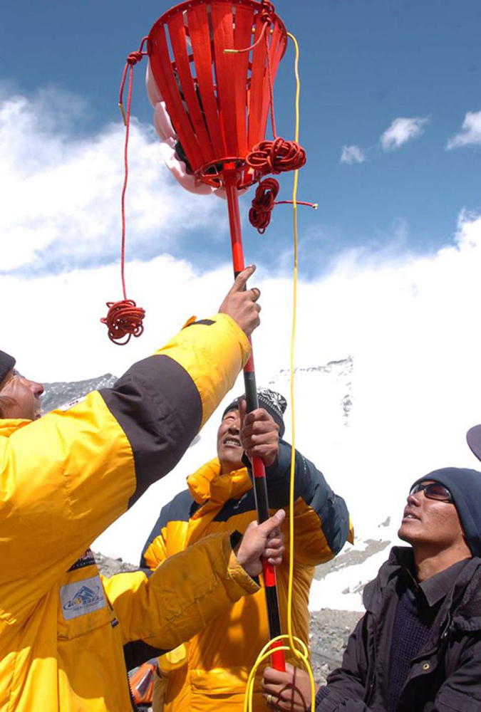 2005年5月19日,珠峰高程測(cè)量登山隊(duì)員再次在海拔6500米的前進(jìn)營地學(xué)習(xí)測(cè)量?jī)x器的安裝固定方法。新華社記者索朗羅布攝