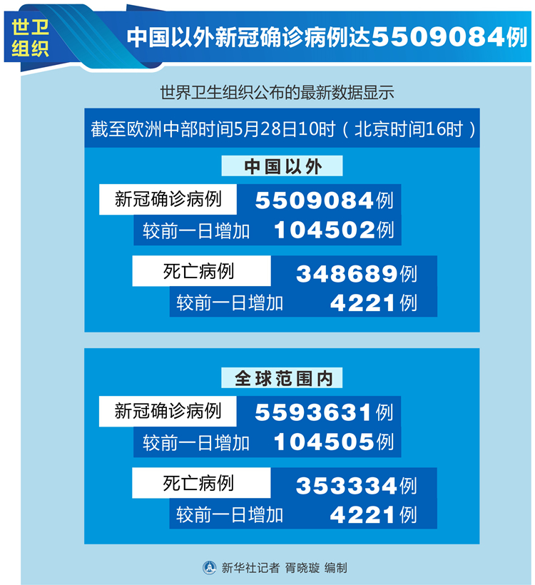 新華社日內(nèi)瓦5月28日電(記者劉曲)世界衛(wèi)生組織28日公布的最新數(shù)據(jù)顯示,中國以外新冠確診病例達到5509084例。